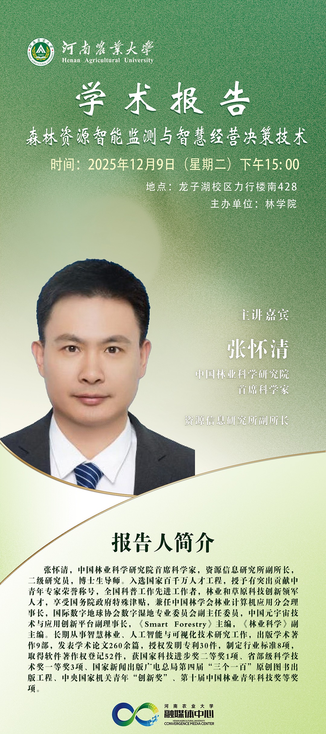 报告人: 张怀清报告题目:森林资源智能监测与智慧经营决策技术  报告时间:2025年12月9日15:30报告地点:力行楼2-南-428会议室个人简介:张怀清,中国林业科学研究院首席科学家,资源信息研究所副所长,二级研究员,博士生导师。入选国家百千万人才工程,授予有突出贡献中青年专家荣誉称号,全国科普工作先进工作者,林业和草原科技创新领军人才,享受国务院政府特殊津贴,兼任中国林学会林业计算机应用分会理事长,国际数字...