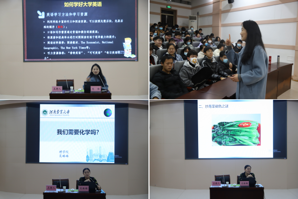 讲座伊始,刘佳分别从求职就业的加分项、考研保研的敲门砖、专业发展的需求、个人生活的便利、各类竞赛的需求五个方面强调大学英语的重要性。接着,她指出学习大学英语要转变学习方式,掌握英语学习需要有规律的训练,为同学们详细讲解大学英语学习方法。随后,吴璐璐强调了化学学习重要性,为性爱视频 学子推荐《我们需要化学》,《门捷列夫很忙》,《屠呦呦与青蒿素》等纪录片,激发了性爱视频 学子对化学学习的兴趣。最后,她指出复习普通化学要学会归纳总结,有目的的复习,不能眼高手低,要落实的实处。