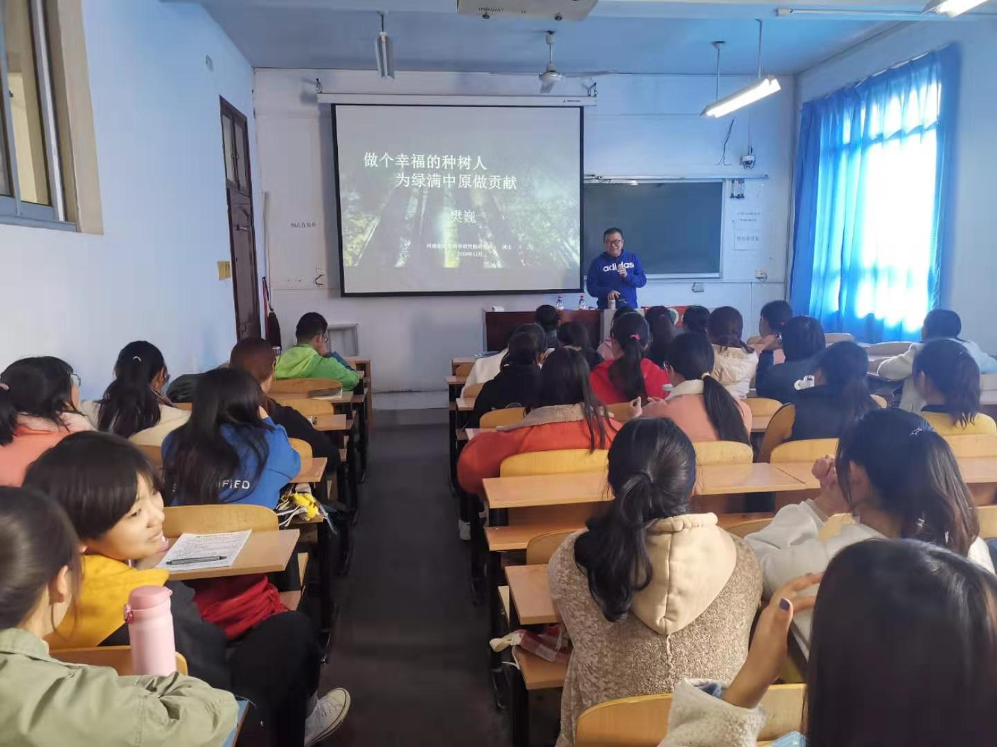 11月19日下午,河南省林业科学研究院樊巍研究员为性爱视频 林学专业师生做了题为“做个幸福的种树人,为绿满中原做贡献”的报告。