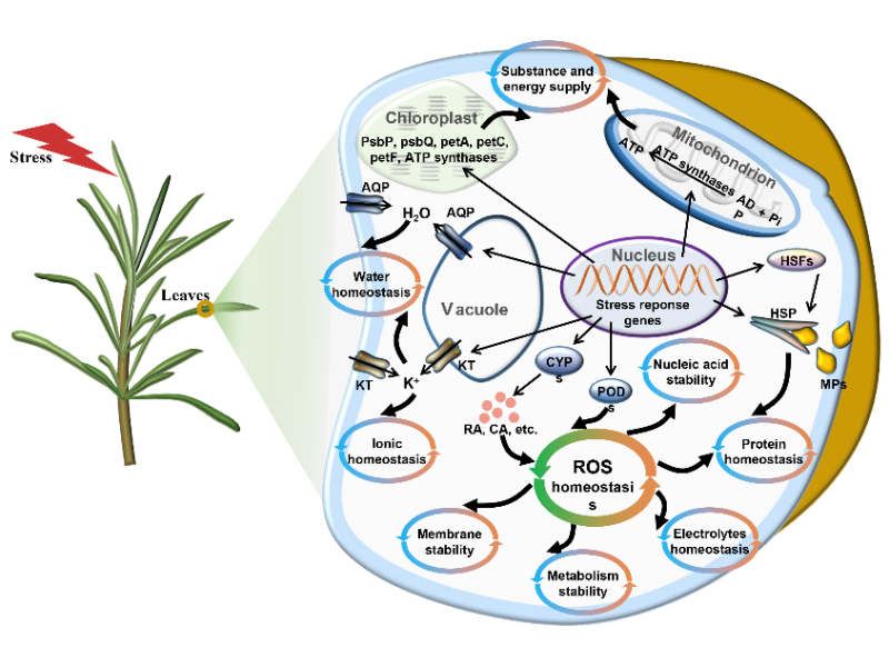 具有“海洋之露”之称的迷迭香为常绿芳香灌木,具有耐受干旱、高温、盐碱的多抗性特性,其叶片中的抗氧化物质(如鼠尾草酸/酚、迷迭香酸等)活性极强,含量高达2.5%-4.5%,广泛用于制备天然抗氧化剂和功能性精油,在食品、化妆品、生物医药等方面具有重要的经济价值。该论文以培育的多抗性新品系Albus-2为材料,构建了迷迭香高质量染色体水平基因组(1.17 Gb),并将97.96%的序列锚定到12条染色体上,注释后获得46121个蛋白质编码基因和1265个非编码RNA基因,基因组完整性为96.22%;在1918个发生扩张的基因家族中,35个基因家族参与了抗氧化物质的生物合成,这些扩张的基因家族增强了迷迭香对不利环境的适应能力;进一步通过转录组学和代谢组学联合分析,解析了与环境适应相关的迷迭香抗氧化物质的组织特异性分布规律;通过干旱、高温、盐害等不利环境胁迫实验,揭示鼠尾草酸、迷迭香酸和黄酮类化合物通过调节活性氧(ROS)稳态在应对非生物胁迫中的响应机制,即通过光合作用、物质和能量代谢、蛋白质和离子平衡的协同作用维持细胞的稳定性,提高了迷迭香抵抗恶劣环境的能力。以上研究结果在迷迭香的适应性进化和抗氧化成分抵抗恶劣环境的机理方面提出了新的见解,为调控抗氧化成分含量、培育多抗性良种的精准育种提供了新思路。