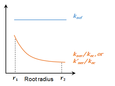 图4. 吸收根(蓝色)与菌根真菌(橙色)的碳利用效率(单位碳投入下的养分收益)随根半径的变化趋势