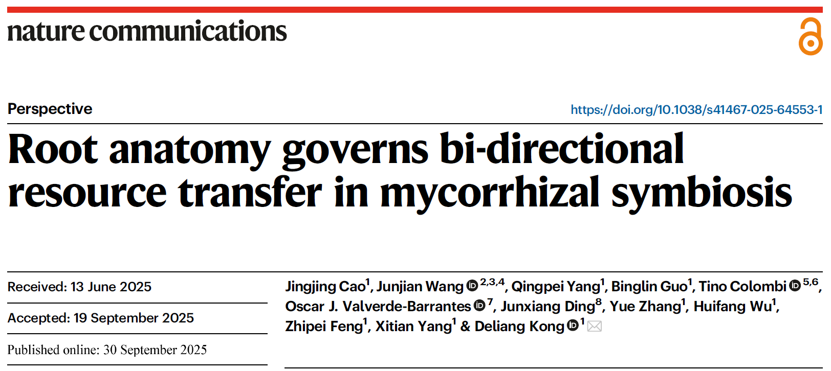 孔德良教授团队在国际顶级期刊《Nature Communications》上发表题为《Root anatomy governs bi-directional resource transfer in mycorrhizal symbiosis》的观点论文。本研究首次提出了“碳-养分双向转运理论”,整合了根系解剖结构、能量成本,以及菌根真菌发生部位这些重要的生物物理特征,为我们认识根与菌根真菌之间的协同进化和环境适应性提供了新的研究思路。